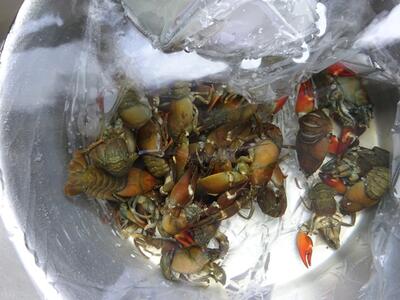 今回の活動はウチダザリガニを食用捕獲として申請したので,捕獲したザリガニは博物館で冷凍され、翌週に試食する予定です。