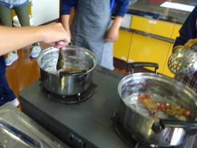 生徒たちは恐る恐るザリガニを鍋に入れ、15分間以上の過熱、殻をむく、という工程を経て試食していました。
